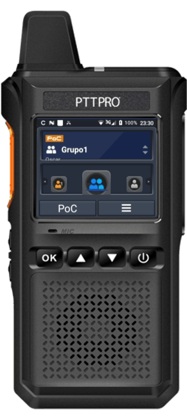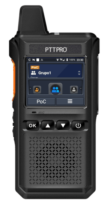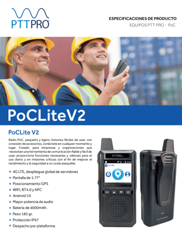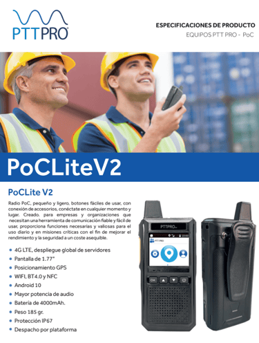 El equipo PocLite ofrece una gran facilidad de uso y de configuración, gracias a su diseño ergonómico y resistente con protección IP67, pantalla a color de 1.77", botones laterales para control de volumen y PTT de rápido acceso, además de una tecla SOS para el envío de alertas de emergencia.